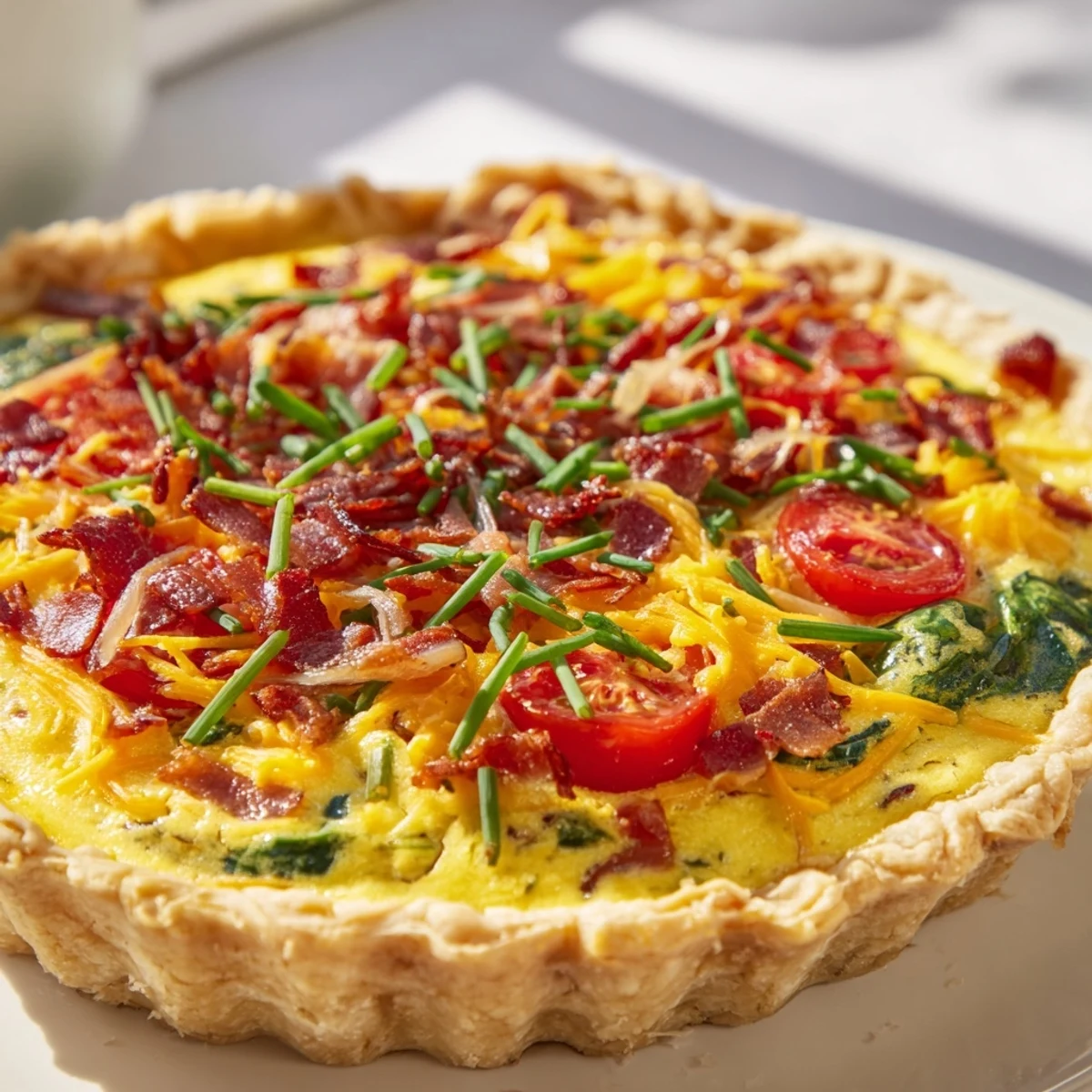 - Scatter the cooked bacon, spinach, tomatoes, and spring onions evenly over the pastry base, then sprinkle the cheddar cheese on top.