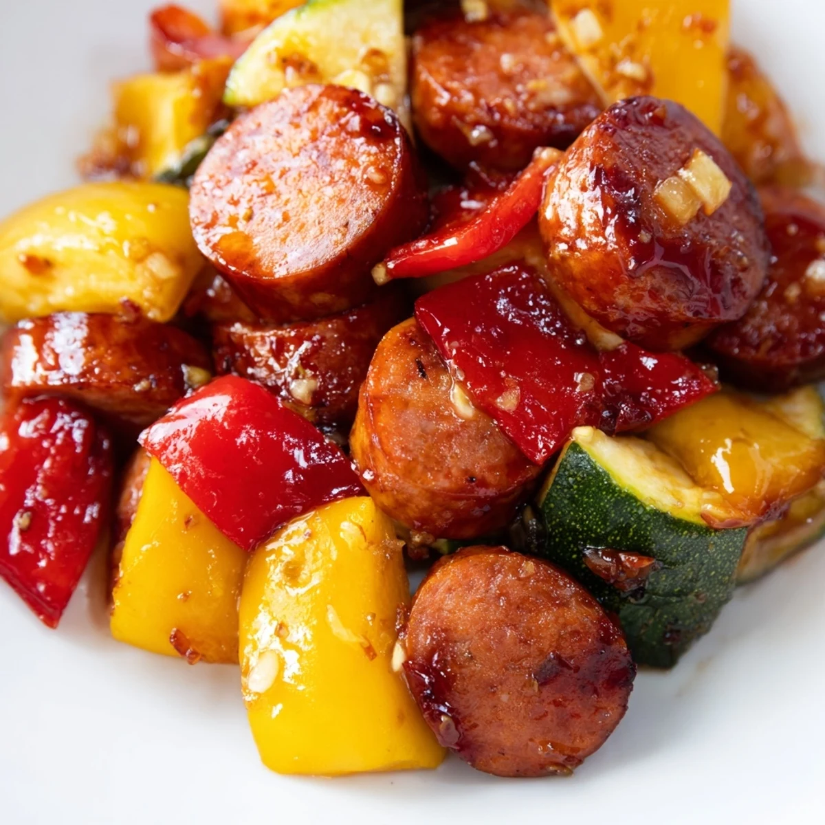 This hearty skillet combines smoky kielbasa sausage with colorful bell peppers, zucchini, red onion, carrots, and snap peas. The vegetables are stir-fried until tender, then tossed with browned sausage and a homemade honey garlic glaze. The sauce, featuring honey, garlic, soy sauce, and spices, creates a luscious coating that balances sweet and savory flavors perfectly.