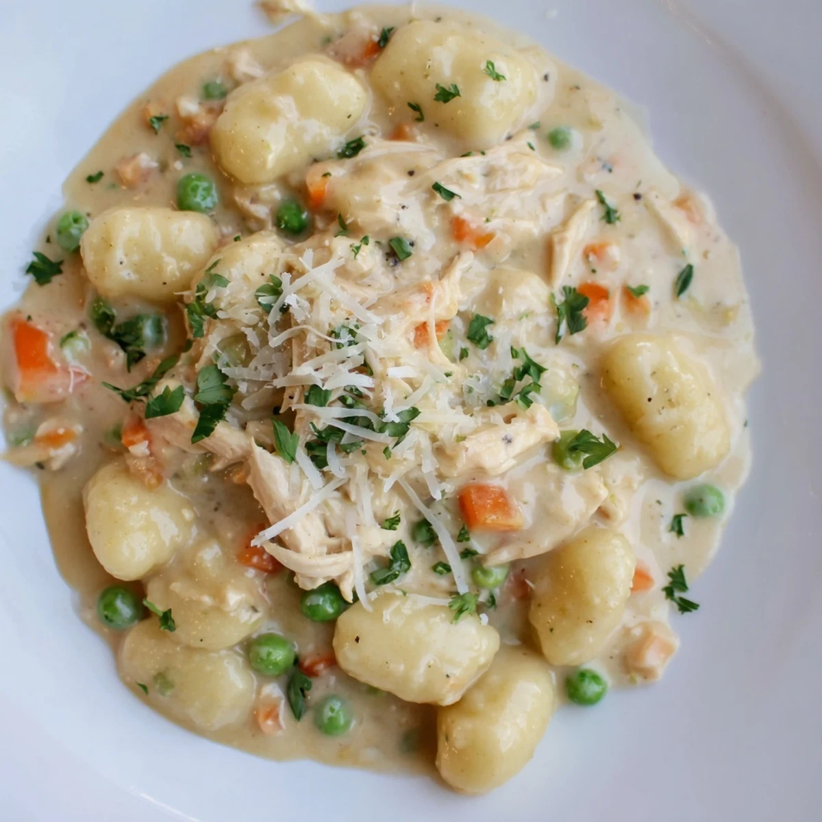 - Fold in uncooked gnocchi, shredded chicken, and frozen peas, making sure those little potato pillows are mostly submerged in the sauce