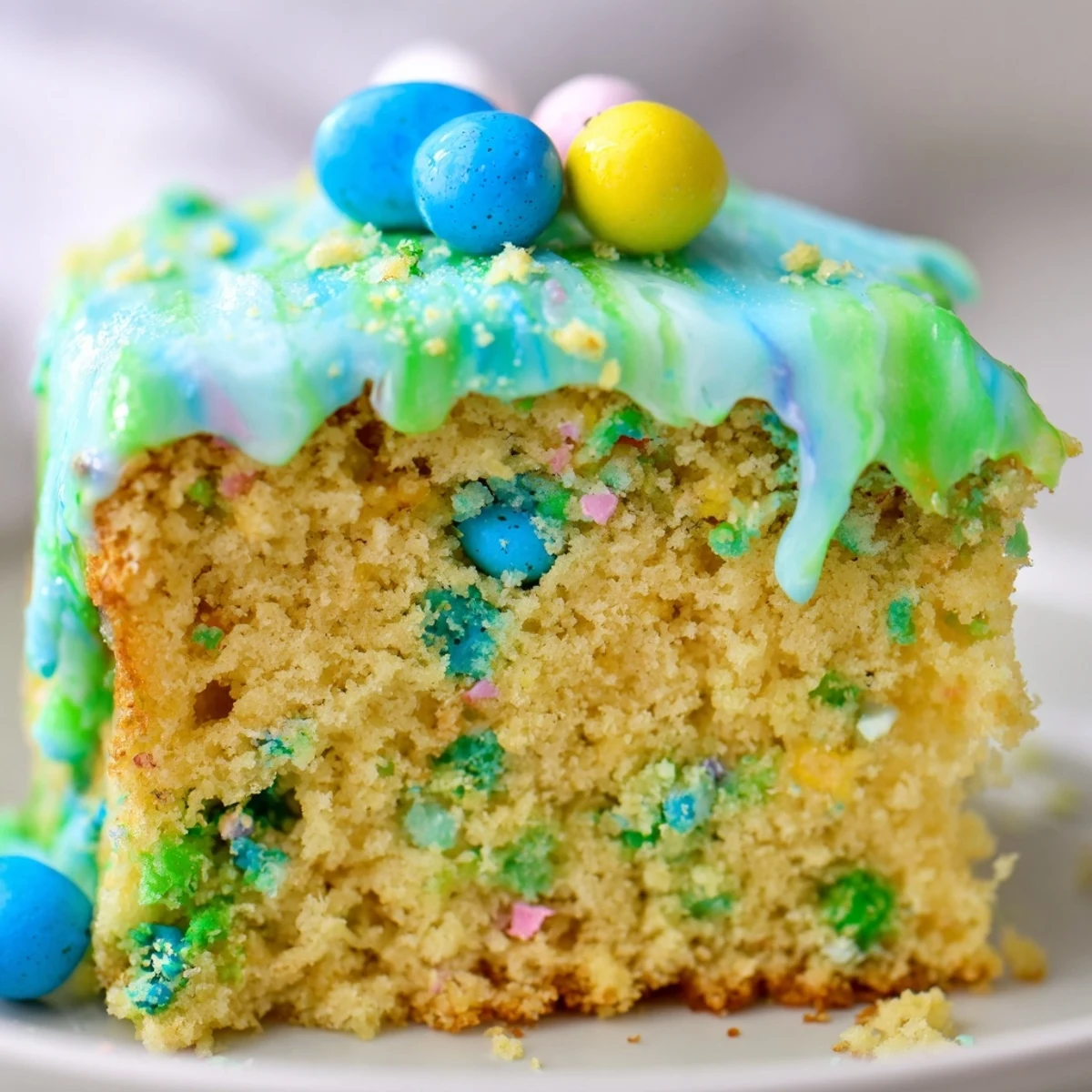 This tender vanilla snack cake features crushed candy-coated robin eggs folded into the batter, creating colorful specks throughout. The cake is topped with a playful pastel glaze that you can customize with blue and green food coloring for a festive spring look. Whole robin eggs garnish the top for extra crunch and whimsy.