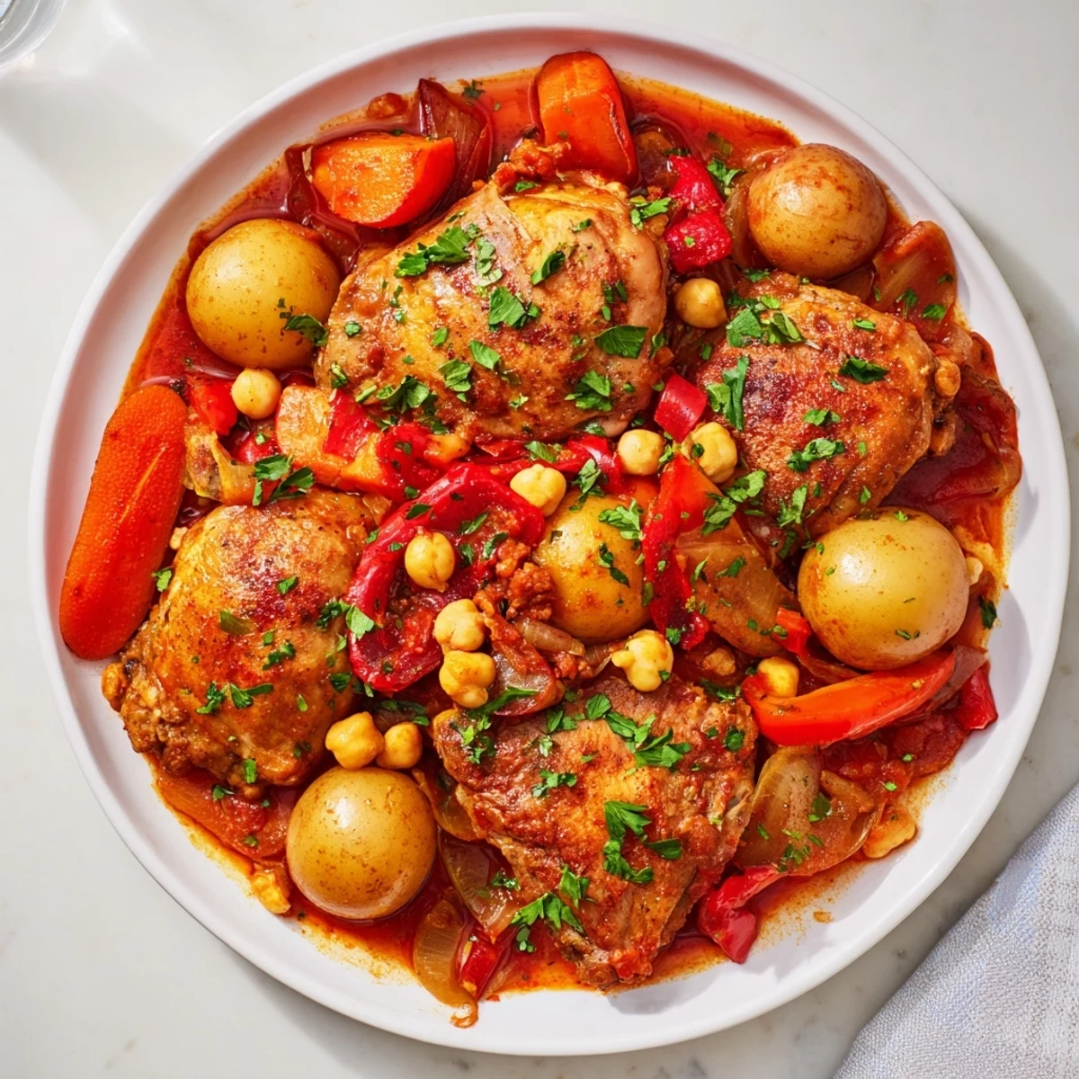 This slow cooked dish features tender chicken thighs combined with vibrant vegetables like bell peppers, carrots, and baby potatoes. Infused with smoky paprika, cumin, and a hint of cayenne, it offers a rich, warming flavor without using chorizo. Chickpeas add texture and protein, while the long cooking time ensures the blend of spices fully permeates the dish. Perfect for an easy, satisfying main course with a Spanish-inspired touch and gluten-free, dairy-free ingredients.